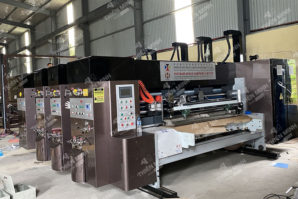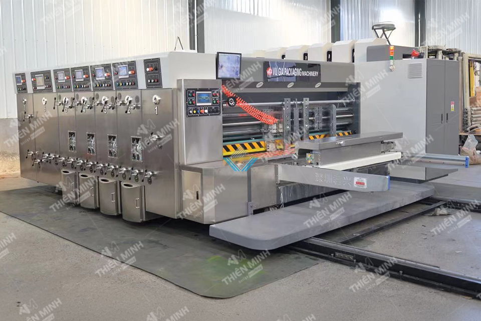 Tích hợp đa công đoạn trên một dây chuyền: Đây là điểm mạnh vượt trội. Máy in Flexo của Thiên Minh có thể vừa IN, vừa CÁN MÀNG bảo vệ, vừa BẾ DEMI (cắt nửa đứt để lột tem) và CHIA CUỘN thành phẩm ngay trên cùng một hệ thống. Điều này giúp tối ưu hóa thời gian, giảm thiểu sai sót và đảm bảo chất lượng đồng nhất.